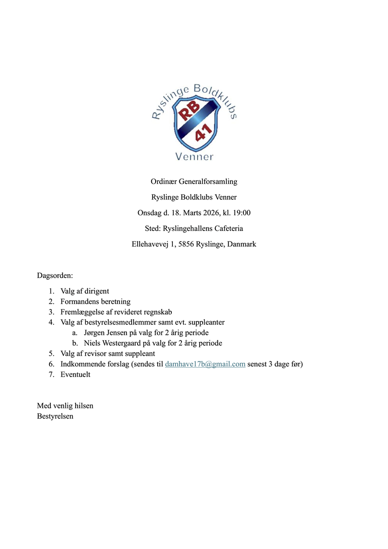 Ryslinge Boldklubs Venner inviterer til årets generalforsamling d. 18/3 - 2026 kl. 19:00 i Ryslingehallens Cafeterie.